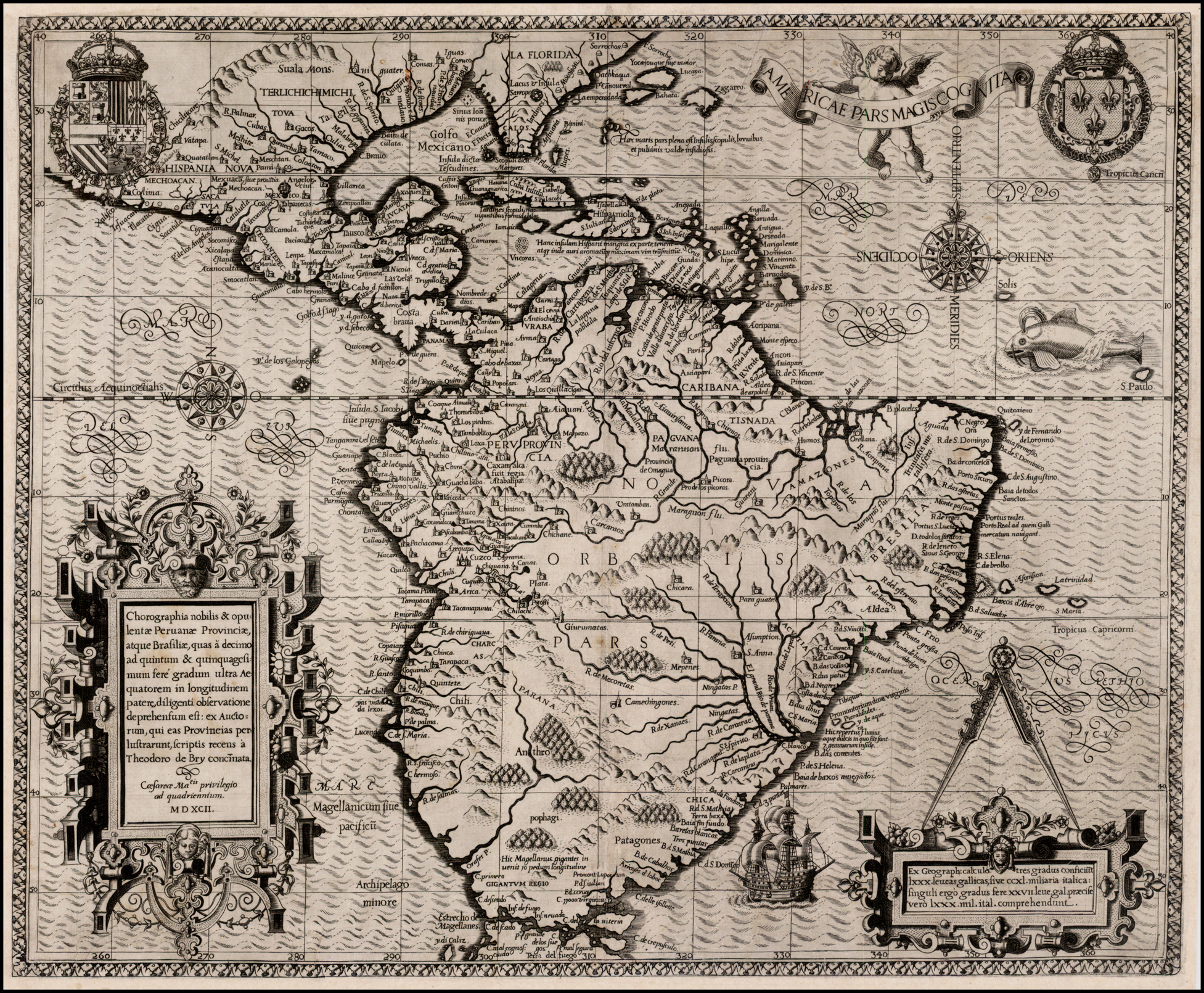 The map appeared in the 3rd Part of De Bry's Grand Voyages, illustrating the accounts of the voyages of Johann van Staden and Jean de Lery during the 1540s and 1550s. The cartography of North America is based upon Jacques Le Moyne's map of Florida, which De Bry published in 1591, making this the second appearance of Le Moyne's cartographic information on a printed map. A masterful engraving of what was then all of Spanish America, including the southern United States. South America is based on the 1587 Peter Martyr map and works by Gastaldi.