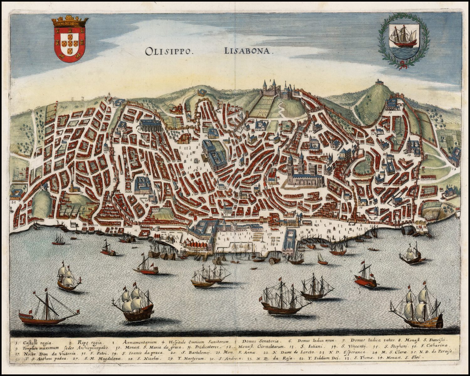 Striking bird's-eye view of Lisbon from the Tagus River, showing the city as it was before the 1755 earthquake that leveled much of the older parts of the city.